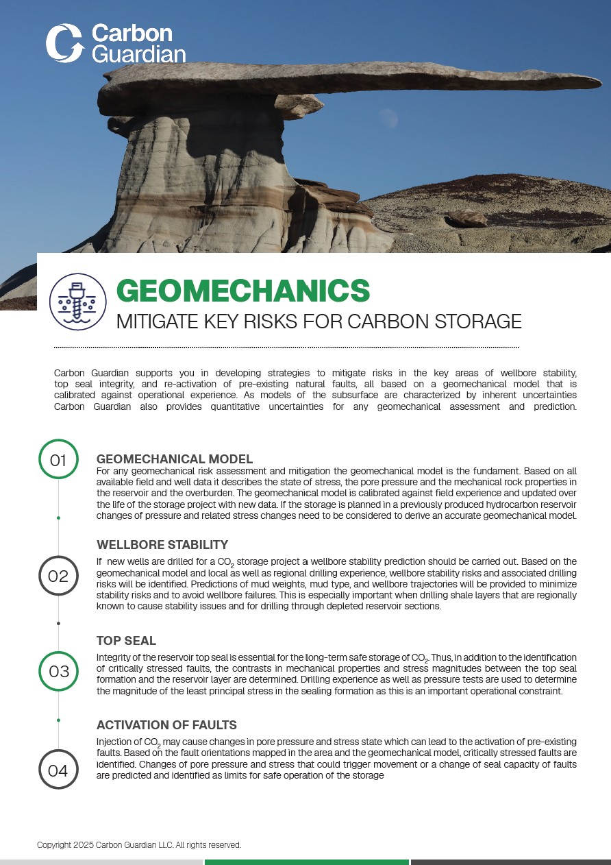 Geomechanical Model and Interpretation: The model of stresses and mechanical properties in the reservoir formation and the overburden is crucial to predict the mechanical risks and behavior during and after the injection phase. All available data are used to derive and calibrate the geomechanical model. Based on this model risks are identified and mitigation strategies proposed. Experts at our partner Subsurface Alliance bring in depth expertise and global project experience to your CCS project.
